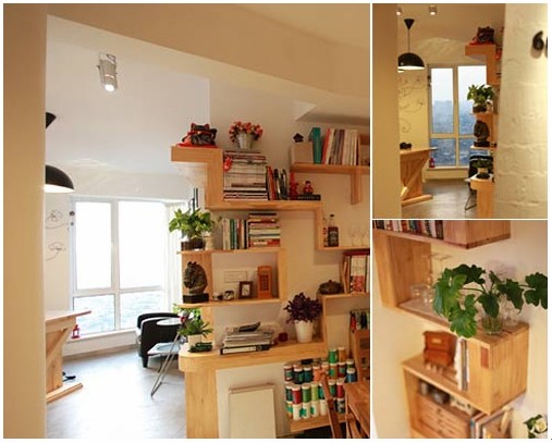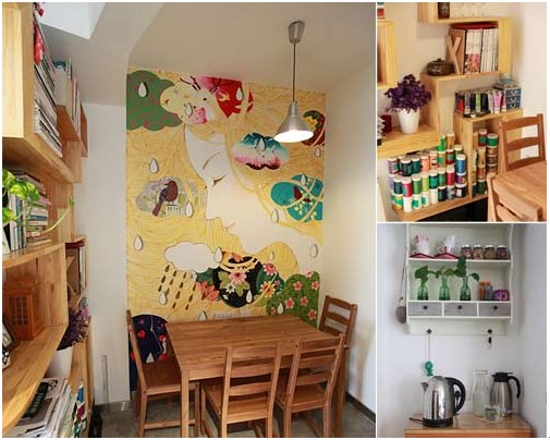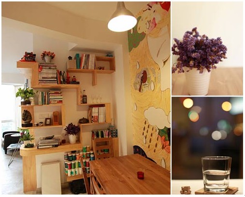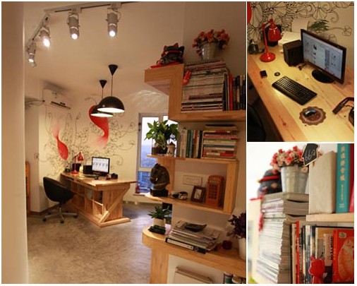 原木色的純實(shí)木書架上,錯落有致的擺放著各種各樣書籍與小裝飾品。最下層擺放著手繪必備的各色顏料。生命力旺盛的綠色小盆栽,紫色浪漫的勿忘**花,小清新與浪漫并存。