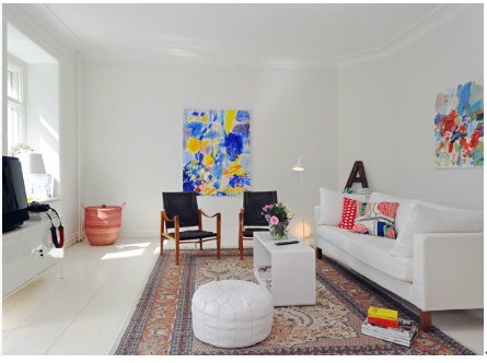 白色的空間內(nèi)可以很大限度的施展你的想象力,民族氣息的地毯,抽象的裝飾畫,墻角的A字母,四方的茶幾等。每一樣物件都很好的充填了白色的空間,讓單調(diào)的空間富有生氣。窗外陽光的照射使房間更加明亮。