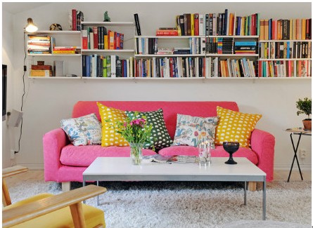粉色的沙發(fā)、多彩的靠枕,相對(duì)豐富的色彩卻沒有妖嬈的氣息只有溫馨的舒適。背后的書籍是閑暇時(shí)的樂趣,厚實(shí)的毛絨地毯帶來和裝飾一樣舒心的踏實(shí)感。