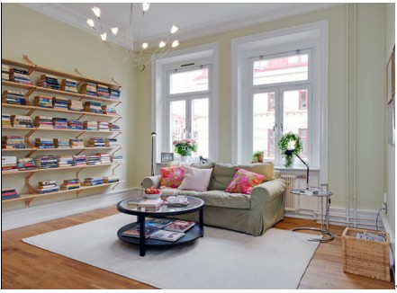 米黃色的墻面比白色更多了那么一絲的溫暖,窗下的布藝沙發(fā)柔軟舒適。淺灰色的布套配以粉色的印花,北歐的簡(jiǎn)潔風(fēng)格中加點(diǎn)自己個(gè)性的小裝飾。墻面的層架上整齊的堆放書籍,午后在清新自然的小屋中讀本趣味盎然的書好好放松一下。