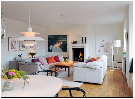 白色的墻面上黑色的簡(jiǎn)約層架,即是裝飾品又是儲(chǔ)物空間。熊熊燃燒的篝火也許不太適合中國的家庭,但仿壁爐式的取暖爐配合一下煙囪的造型,在寒冷的天帶來暖風(fēng)的同時(shí),不同用出國就能感受北歐般的生活。