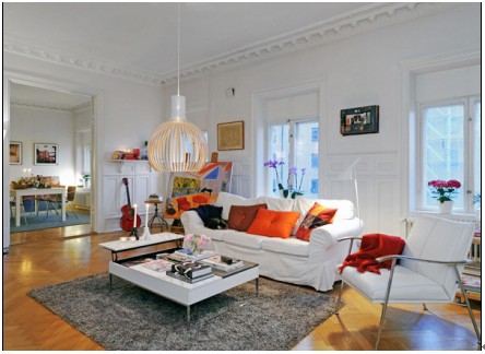 白色的沙發(fā)上擺放著紅與粉的靠枕格外耀眼,粉與紅色彩又淺到深逐漸變化,在大片白色的襯托下有著很強(qiáng)的活躍感。墻面上懸掛著大小不同的壁畫,使白色的墻面不會(huì)顯得單調(diào)。搖動(dòng)靠椅的出現(xiàn)在小清新的生活中添加些一絲樂趣。