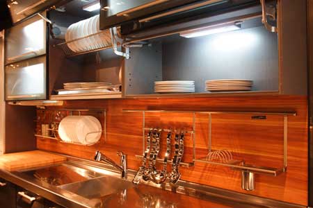 一般家用廚房在進行升級改造時,各種專業(yè)廚房的設計元素和概念被大量使用,使家用廚房的設計更加趨向人性化。簡單的如刀具的擺放,設計者會選用可以橫向移動的分類刀具架,并在刀具架前面裝設可以遮擋水滴、油跡的防水玻璃,使用相當方便。專業(yè)廚房內所有設備幾乎都固定在櫥柜內,櫥柜里塞滿了各式炊具,多個爐頭的燃氣灶,可以同時進行幾個菜的燒制。對于一個專業(yè)的大廚來說,每件東西都應該有它的安放之處,而且都應該放在適當?shù)奈恢?,用四個字來形容就是“恰到好處”。