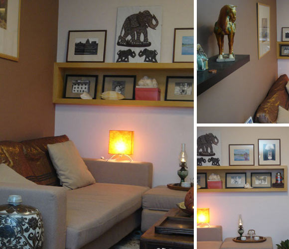 這個(gè)混搭小客廳里,收納著MM所有的得意收藏。時(shí)尚簡約的相框,全是MM旅游拍攝的佳品。淺灰色的簡約沙發(fā),同色系的抱枕,方形的黃色燈罩臺燈,中式古典的裝飾花瓶,雖然這些都是不太搭調(diào)的,但是卻讓客廳增添了一絲古樸古典的文化韻味。