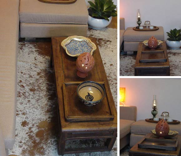 現(xiàn)在我們來細(xì)看MM在客廳里的得意之作吧??粗孛嫔纤坪跤泻芏嗬鋵?shí)它是一張獨(dú)特的地毯,MM說他在高原上第一眼就看上了它,蜚它不可就買了回來。為了讓這張地毯發(fā)揮更大的作用,特意又淘了這個(gè)復(fù)古的茶幾回來。
