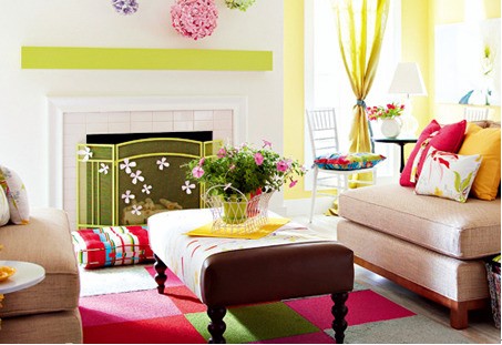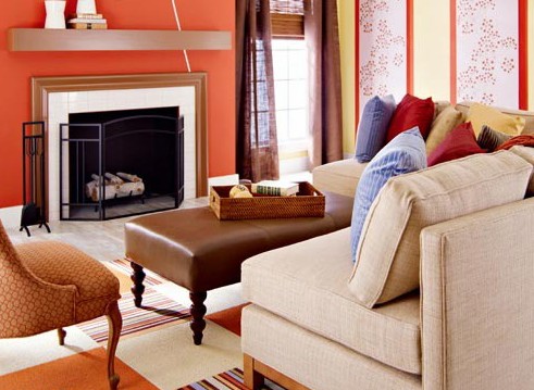 客廳選用大自然的橙紅色調(diào)裝飾房間,營造溫馨/喜悅/溫暖的氛圍。通過窗簾、地毯、裝飾品、墻面色彩的方法來營造春季的感覺,家具的組合方式和位置可隨意轉(zhuǎn)換,增添新鮮感。