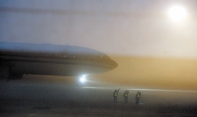 昨天深夜,浦東機場工作人員向正在起飛的航班揮手。當時大霧籠罩,來滬航班無法降落。