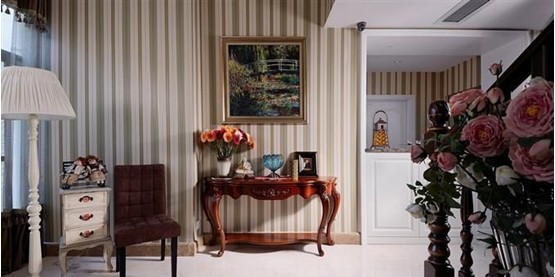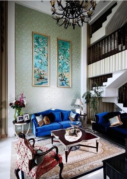 挑高的客廳是空間的最佳主角,繁復(fù)古優(yōu)美的吊燈傾瀉而下,在冷色調(diào)為主的空間里營造出溫暖的氛圍。豎紋線條的壁紙色彩清雅,增添了空間的立體動感,對立墻面上的兩幅油畫畫作則與之遙相呼應(yīng),構(gòu)成活潑的空間動線。