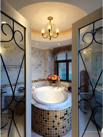 主浴室推門就是一個大大的浴缸展現(xiàn)在你面前,還原了衛(wèi)生間的本態(tài),腰線與浴缸的馬賽克相呼應(yīng),再配上大理石,使的整個空間張力十足。