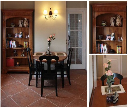 餐廳的地面選擇了棕色地磚,便于打理和清潔。簡潔實用的餐桌,充分的利用了空間,講究對稱美。整個色調上細膩高貴,彰顯出美式家具的魅力。