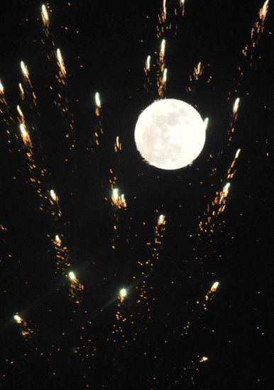 2009年2月9日,哈爾濱,焰火與圓月相映成趣。