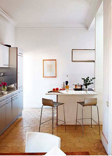 空間獨特的幾何圖形地面設計,土黃色的地板很好的凸顯出白色的墻面,也起到拉伸空間的作用。小料理臺延伸的設計構思也很不錯,這樣不僅能將餐廳與廚房合二為一,更使得廚房溫馨許多。