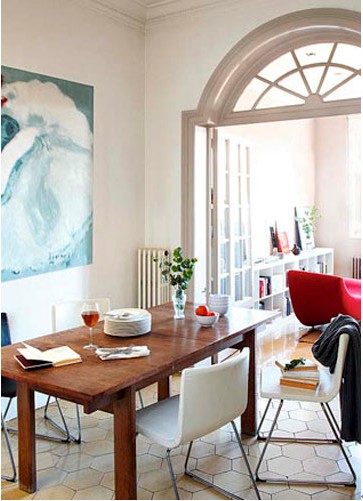 敦厚的木質餐桌造型讓空間看起來大氣很多,拱形門的運用則有良好的視覺通透性。飾品方面色彩的對比強烈,立刻讓空間變得飽滿和鮮活起來。