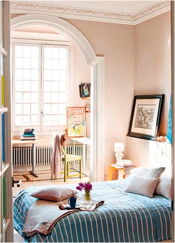 藍色的條紋床品占據了大部分的視線范圍,讓臥室看起來清新而舒適。五彩繽紛的幾何混搭而成的格子拱門,詼諧又具有變化的色調提升空間的趣味性,也消除了藍白色調造成的冷清感。