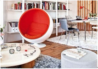 白色的空間內(nèi)必定少不了糖果色的點綴。一把造型新穎的休閑靠椅,一盞橘紅色的臺燈,書架上琳瑯滿目的書架,都是紅與白的完美搭配,素雅中隱藏著熱情,也使整個空間充滿現(xiàn)代感。