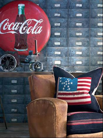 在美式風(fēng)格中,懷舊復(fù)古風(fēng)可以演繹的很完美。美國國旗的圖案一直是經(jīng)久不衰的,搭配在做就的棕色沙發(fā)上,讓人聯(lián)想到西部牛仔的英雄時(shí)代。在懷舊風(fēng)大行其道的當(dāng)今,沙發(fā)、休閑椅上的一個(gè)靠墊,可以在不經(jīng)意間讓懷舊復(fù)古的意味駐留在家中。