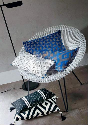 不同色系堆疊在一起,極具光澤度的面料讓靠包不再作為一件配飾出現(xiàn)在客廳的沙發(fā)上。將大小不同的靠墊,組合搭配在客廳或臥室的躺椅上,相同圖案不同色彩、面料的使用,營(yíng)造出空間的和諧統(tǒng)一。