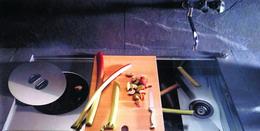 一般櫥柜的洗滌區(qū)和料理區(qū)都有一定距離,洗完菜往往要盛在容器里拿到切菜的區(qū)域,很麻煩。如果在水槽區(qū)域加裝上這樣的可推拉式的砧板就方便多了,