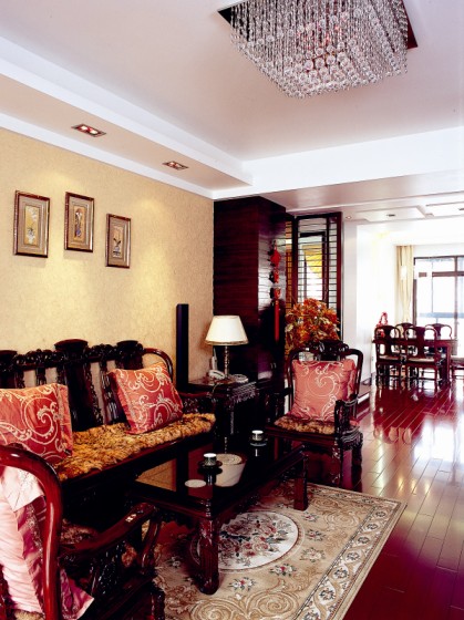 略帶古典中式風(fēng)格的客廳,燈具是華麗的水晶燈,似科這里更應(yīng)該出現(xiàn)燈籠這類似統(tǒng)才更美觀,但不要忘了,家是要滿足平日生活需求的,我們需要電,它更能給予我們生活方便。