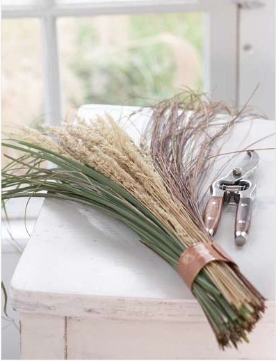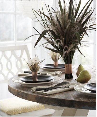 哈哈  草葉也當(dāng)上了主角了 紫葉狼尾草、馬尾草、和細(xì)葉芒、經(jīng)過修整和挑選之后,被固定在了一個用銅管制作的獨立中空裝飾物中。擺上餐桌,竟褪去了原本的粗獷,而多了一些自然飄逸。