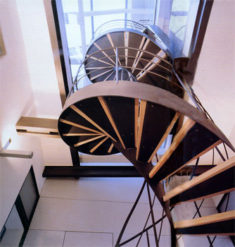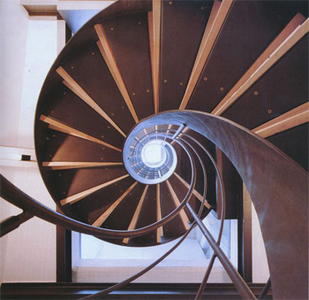 盤旋而上的旋梯不僅具有強烈的動態(tài)美,而且占用空間小。其中180度的旋梯是一種真正能節(jié)省空間的樓梯形式,無論居室平面狹窄還是寬廣,它都可以根據(jù)旋轉(zhuǎn)角度的不同而有所變化。而旋轉(zhuǎn)的扶手借助于中心柱蜿蜒向上,動感表現(xiàn)力更強,因而也最常見。