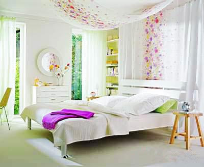 白色地面、家具、床品、窗簾,用大面積的白色營造出干凈通透的感覺;少量簡潔設(shè)計(jì)的臥室家具搭配純棉材質(zhì)的床品,呈現(xiàn)出一派簡約率真的風(fēng)格,而碎花床品和纖巧細(xì)條紋讓空間呈現(xiàn)出可愛的性感一面