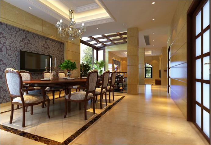 雅致的背景造型、考究的配飾、精湛的工藝,均是現(xiàn)代與古典相融的結(jié)晶,讓主人的審美情趣在優(yōu)美的線條、和諧的色調(diào)中自然流露。從玄關(guān)到客廳再到餐廳,空間流暢通明,名貴內(nèi)斂的淺調(diào)天然石料是地面和墻身的主材,石材與原木飾面墻壁形成鮮明而自然的對(duì)比。純凈的米色奠定了居室的基調(diào),放棄傳統(tǒng)歐式風(fēng)格中繁復(fù)的曲線與雕花后,明快的直線條勾勒出空間的清爽氣質(zhì)?!】蛷d的沙發(fā)背景運(yùn)用了西班牙米黃仿古石飾面中間用石材線條內(nèi)貼墻紙,墻紙中間掛上一幅藝術(shù)油畫(huà),視覺(jué)效果既豐富又有立體感。一套大氣的組合歐式沙發(fā)配上實(shí)木的茶幾顯得主人家的品位。并彌漫出一份現(xiàn)代而古典的韻味。