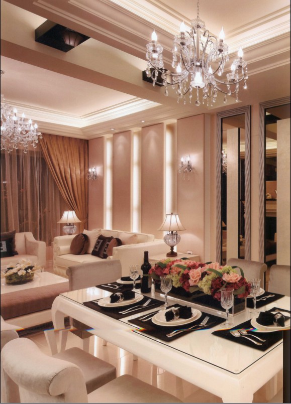 第一感覺是否是層高好高啊!這個(gè)直線角度的拍攝可能有一定原因,但它確實(shí)有著令人羨慕的層高在。這是客餐共處的空間,很常見,設(shè)計(jì)師重視空間的開闊及彈性需求,透亮的水晶主燈為空間閃亮開場拉開帷幕。主題餐廳華麗豐富并具層次感,詮釋著輕奢華的表情。