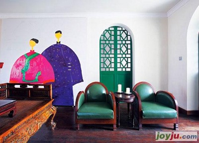 同時(shí),原先的方形門框也被改造成圓拱形,頗有傳統(tǒng)窯洞的樸素質(zhì)感。在空白的墻面上,無一例外地掛上了謝成成的繪畫作品,每一幅都有各自不同的色彩。他用最現(xiàn)代的手法表現(xiàn)出中國(guó)的傳統(tǒng)意境,既懷舊又不乏輕松與幽默,這奠定了整個(gè)空間的格調(diào)。