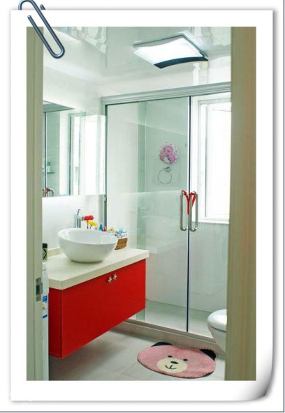新房衛(wèi)生間設(shè)計也要充滿些喜氣味,越是小的空間更能營造出溫馨的氛圍。一個大紅色的浴室柜就能很好的打破冰冷的衛(wèi)生間氣氛,可愛粉色小熊防滑毯也能起到裝飾作用。淋浴房的把手也系上了紅色的絲帶,增加幾分甜蜜。