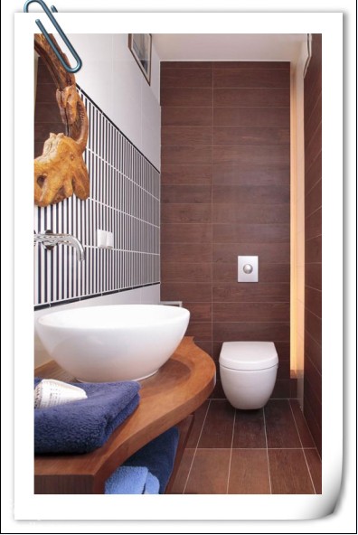 長而狹窄的衛(wèi)生間也能打造出氣派寬敞的空間效果,并有著自己的風(fēng)格。棕色的啞光地板磚讓整個空間顯得低調(diào)沉穩(wěn),同時又很有質(zhì)感。浴室柜和浴室鏡框都采用了木質(zhì)材料,富有質(zhì)感且充滿自然風(fēng)味。黑白兩道的條紋瓷磚給這個空間帶來不一樣的氣息,有點現(xiàn)代感的裝飾,卻也和整個空間裝飾相協(xié)調(diào)。