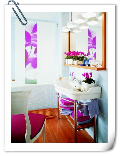小型衛(wèi)生間的多功能設(shè)計一樣很強(qiáng)大,進(jìn)門靠左邊是一個浴室柜、面盆、浴室鏡,亮面的烤漆浴室柜易打理又防潮、防腐。紫色與白色的完美搭配,給人無限的浪漫聯(lián)想。考慮到大面積使用紫色,會使空間整體變深,可能產(chǎn)生壓抑感。所以,在色彩搭配上紫色作為點綴色最為保守。