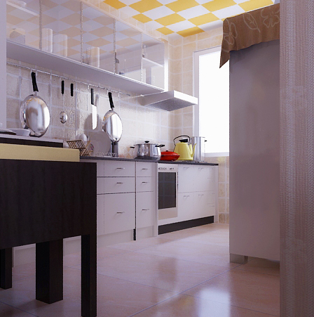 此戶型為兩室一廳的房間,面積不大,基本上是沒(méi)有餐廳的位置,為了讓空間看起來(lái)擴(kuò)大些,設(shè)計(jì)師把原始的廚房墻打掉,做成一個(gè)開(kāi)放式的現(xiàn)代廚房,并在餐廳及廚房中用用一些實(shí)木線條做隔墻。并噴上白色的油漆。廚房的櫥柜面板采用的是白色烤漆板,配上黑色的大理石臺(tái)面顯得整齊又大方,廚房功能是儲(chǔ)存生活的必備,平時(shí)做飯也就是儲(chǔ)存,洗滌和烹調(diào)。由于廚房的空間不大,但功能卻很多,廚柜的每一個(gè)抽屜內(nèi)部的功能都是不一樣的,各種內(nèi)置式的抽屜和金屬拉藍(lán)。給主人提供了方便的操作空間。廚房的頂采用黃白相交的方形鋁扣板。地面鋪600*600的防古地磚一直延伸到客廳。餐廳的餐桌選用的是胡桃木配上軟軟的黃色布藝墊。餐廳的燈光既不能太強(qiáng)又不能太弱,燈光要以溫馨的黃色為基調(diào),再配上藝術(shù)吊燈?餐廳旁邊的白色墻上也可以掛上一幅藝術(shù)油畫。增加房間的藝術(shù)氣息。