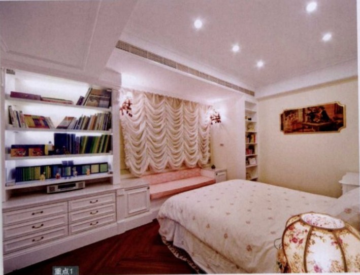 窗簾占空間視覺面積不小,所以窗簾的選擇也會影響空間氣圍及風格。窗簾造型及材質(zhì)決定質(zhì)感,若想讓空間呈現(xiàn)浪漫夢幻的優(yōu)雅,應選擇古典、多層次的窗簾。窗邊規(guī)劃休閑窗臺,連接旁邊的書柜,提升收納功能