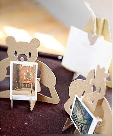 1、小熊照片架??纯催@小熊可愛吧!這就是用廢紙板做成的哦。首先呢做小熊的紙板要有一定的厚度,如果太軟的話支撐不了,容易倒。使它很適合做成支架類的裝飾品,這款卡通動物卡片架就是充分利用了這個優(yōu)勢,平面裁切完成后稍微折疊,就可以穩(wěn)穩(wěn)地立在桌面,你可以在它上面放很多名片或者卡片,小動物可愛的造型,讓忙碌工作的人心情放松。