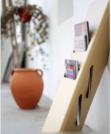 2、斜靠的雜志架。在我們的印象中,雜志架好象不是金屬的就是木頭的,或是藤編的。今天我們的舊紙箱又成了主角——把長方形紙箱裁切后重新組合成梯形,并把上下都斜切掉一部分,使這個簡易雜志架能夠隨時倚靠在墻邊或者家具旁,方便實用也不乏美觀。
