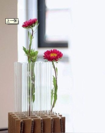 3、這樣 的插花器你見過沒。做起來非常簡單用紙箱裁成幾個單片,并折疊,用試管的寬度做參考等距離切割,將這些紙箱片交錯穿插,形成穩(wěn)定的格子布局。把試管插入,加水后就可以隨意插花。這個花器的好處是:每一個試管都是獨立的,你既可以高低穿插,也可以整齊布陣,紙殼和玻璃的材質(zhì)結(jié)合,會給人特別的感受。