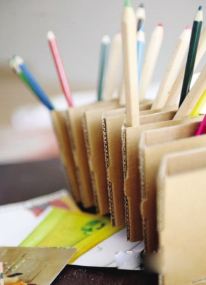 4、手拉手鉛筆插。這是一個極其簡單的裝置,就像一排小孩手拉著手,很適合插放兒童彩色鉛筆。把紙箱裁切成片折疊并穿插在一起,可用釘書針來固定。彩色鉛筆的色彩在牛皮紙色的映襯下更顯鮮艷。