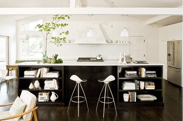 客廳與餐廳的中間還有這樣一個(gè)臺(tái)子,它的功能是雙向的。對(duì)于廚房它是非常實(shí)用的料臺(tái),而對(duì)于客廳,它又是一個(gè)收納空間??梢允占{非常多的需要收納的物品。而上方的燈具也是非常有特色。