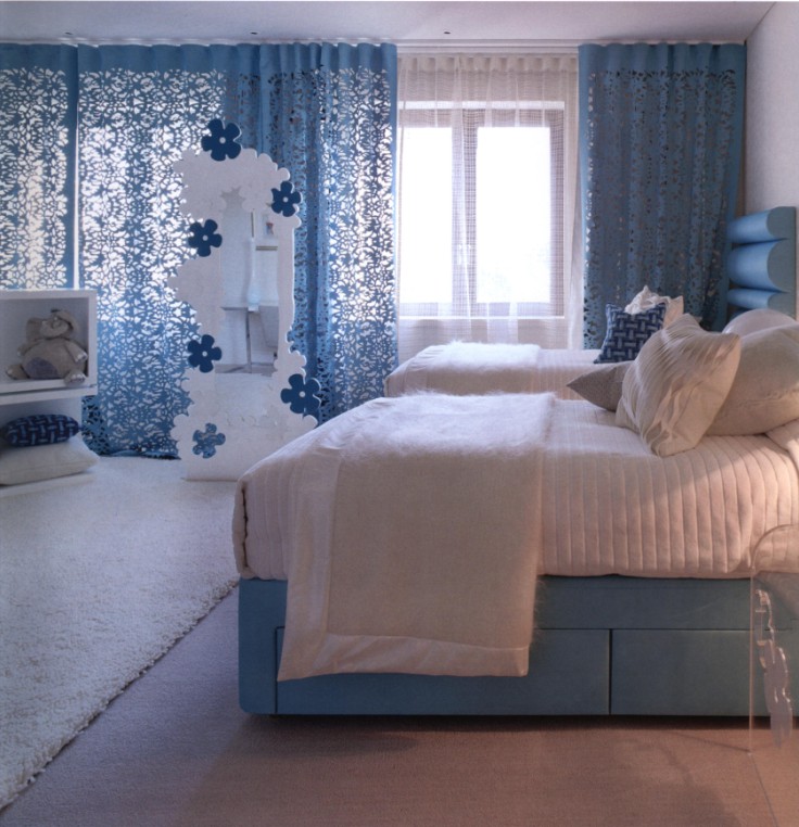 為了突出空間的清雅的氛圍,在這個(gè)項(xiàng)目中有意將窗簾的裝飾元素設(shè)計(jì)成鏤空的花紋圖案,在美化窗簾的同時(shí)又增加了空間的通透性。再配上一層薄薄輕紗簾,朦朧中顯示出高雅的氣質(zhì)。在色彩上采用淡藍(lán)色調(diào),能夠在火熱的夏季里為人們帶來絲絲清爽的感受。