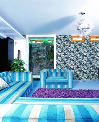 打開聽覺、視覺,一切感觀。自然的采光景觀和綠色墻紙?zhí)羝鹨晃莸那逖?。深灰藍(lán)地面、條紋沙發(fā)支起一墻攀滕。