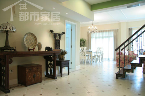 這是初進(jìn)門時(shí)展現(xiàn)在我們眼前的情景。明亮的日光透過紗簾來,整個(gè)房間沒有太多隔斷,感覺上開闊通透極了。左側(cè)的一組中式家居配飾搭配很醒目,紅木條幾、小木柜、瓷盤瓷瓶、老式臺(tái)燈以及一把靠背超高的凳子,這租搭配其實(shí)是隨心所欲而為之的,卻顯然成為了別墅入口處最隆重的一角。