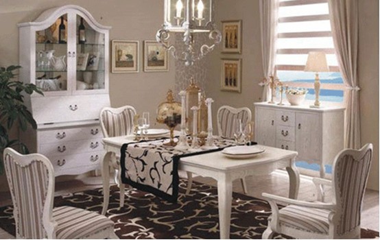 歐式田園風(fēng)的白色餐桌椅,漆面光滑圓潤,精致的紋理雕刻,體現(xiàn)細(xì)節(jié)美,讓人看上去明亮悅目;簡單大方的構(gòu)造,顯得自然大氣,粉色條紋背景墻帶有地中海風(fēng)味,整體設(shè)計讓人感受到的不僅僅是地中海清爽,室內(nèi)的裝飾及紋理圖案卻又散發(fā)著田園氣息。