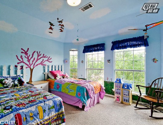 天藍色的房間酷似天空的色彩,整體色調(diào)清新,淡雅。天藍色的背景墻面搭配米色軟木地板,完全符合清新自然的特質(zhì)。兩處大大的玻璃窗透視著外景綠色美麗,到處都可以聞到春夏季自然的味道。為了讓孩子更多的感受到大自然氣息,在屋頂設(shè)計上描繪出朵朵白云,跟天藍色的空間相稱,自然別出心裁,簡單卻美好的手繪設(shè)計。