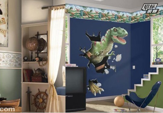 男孩子總是愛充滿冒險精神,喜歡海盜,奧特曼,可能還喜歡恐龍島等。那么,在設(shè)計讓就滿足男孩子們無窮的夢幻和想象力吧!這款手繪墻是不是很逼真呢?色彩的搭配凸顯出逼真的恐龍,幾乎到了以假亂真的效果。