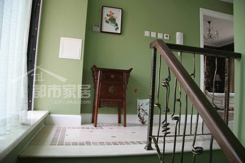 上樓上瞧一瞧去。和別處不同,樓道是泛著灰調(diào)子的綠色空間,柔和而雅致。顏色的運(yùn)用很重要,就拿這綠色來(lái)說(shuō),它經(jīng)常被運(yùn)用在歐式別墅中,已經(jīng)成為了一種經(jīng)典、正統(tǒng)的搭配。然而太艷會(huì)顯得淺薄庸俗,太暗又會(huì)顯得陰郁沉悶,拿捏得恰到好處才是設(shè)計(jì)師的功力所在。不看別的,光是這綠色的調(diào)配就能傳達(dá)出房子的源自經(jīng)典的品味