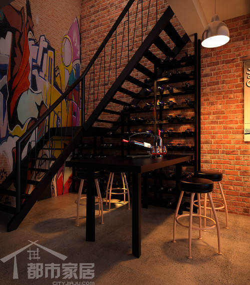 樓梯、酒架、餐桌,幾個黑色的點形成了一個面,與圖一中的沙發(fā)一前一后呼應起來,不會使空間因為一頭黑色面積過大而產生一頭沉的感覺。