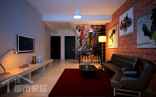 進入這個空間最為醒目的要數電視背景墻和沙發(fā)背景墻的對比了:一面是單一色彩單一形式的灰色墻面,另一面則是排列密集的磚紋墻面。通常家庭裝修都是使用磚紋壁紙來做裝飾,但是該空間的磚面可是一塊塊磚砌起來的。設計師說到作用有兩點:第一就是堵門,磚墻后就是可以通到隔壁的門。第二點:雖然都是磚紋的效果,但是壁紙遠比不上磚塊壘砌效果來的強烈。