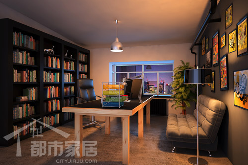 二層書房的設計沿襲了一層涂鴉風格路線,設置了很多的小幅裝飾畫。雖然單幅畫面色彩、形式都十分跳躍,但以深灰色作為底色,又很好的把裝飾畫統一在墻面之上。