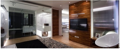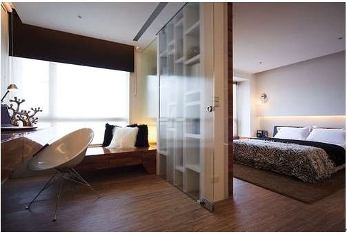 書(shū)房與臥室之間以木格及玻璃拉門(mén)做為隔斷,立柱的紋路不是完全的穿透材質(zhì),在自然的光照下呈現(xiàn)半穿透空間區(qū)隔質(zhì)感,無(wú)軌道的玻璃拉門(mén)設(shè)計(jì),讓兩個(gè)區(qū)域之間更為親密,也可見(jiàn)設(shè)計(jì)師的高超工藝。為了讓臥室更加寬敞,更衣室及后方的主衛(wèi)浴都以清玻璃搭配,打開(kāi)放式衣柜的展示燈,有種精品店的氛圍即刻呈現(xiàn)。